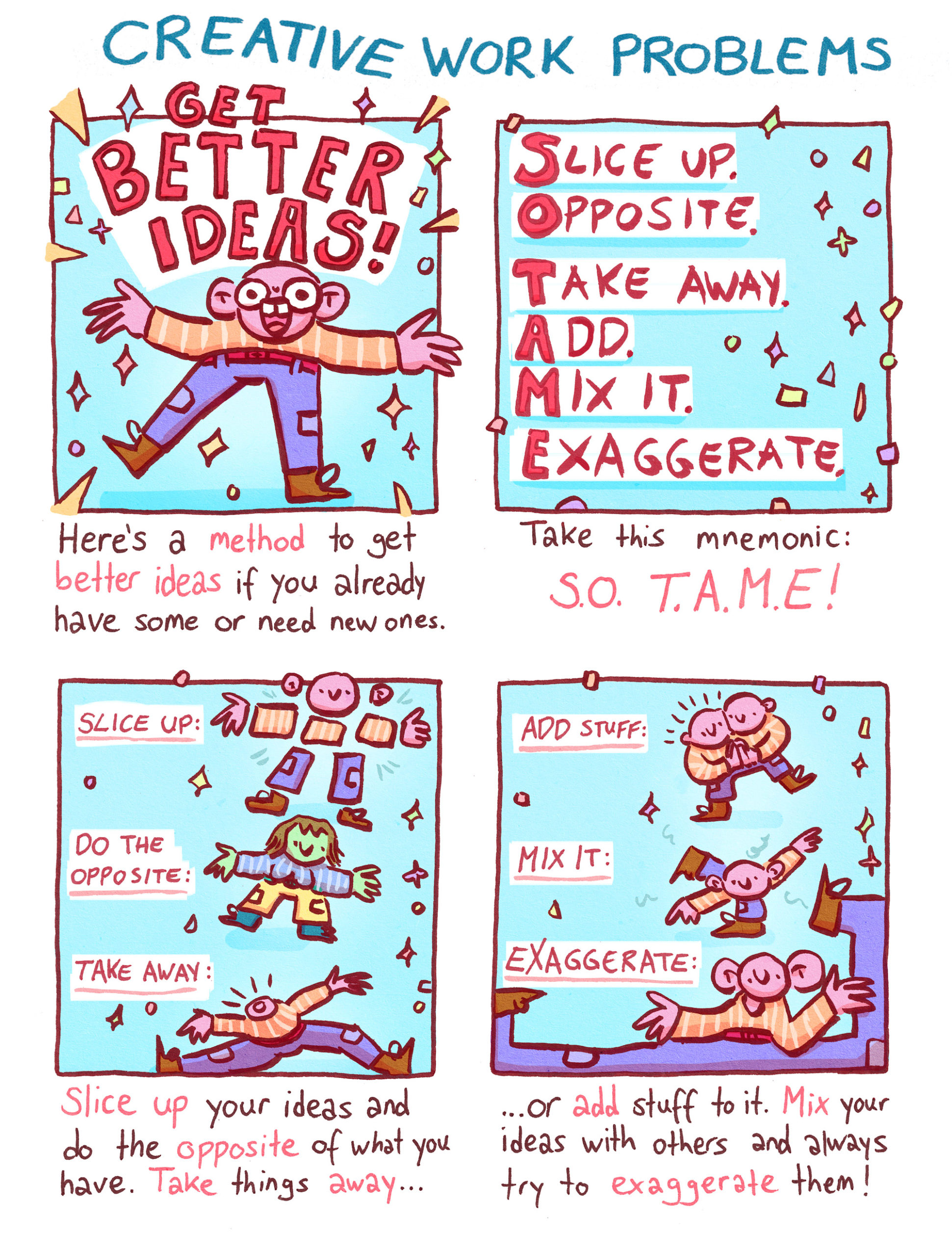 Remember that in the end, an idea is a mix between two thoughts. So mixing two ideas is always a good way to get new ideas. Even dull ideas can get more exciting, when you mix them with something new. With this method, you’ll be able to get some … well, ideas … to get better ideas.