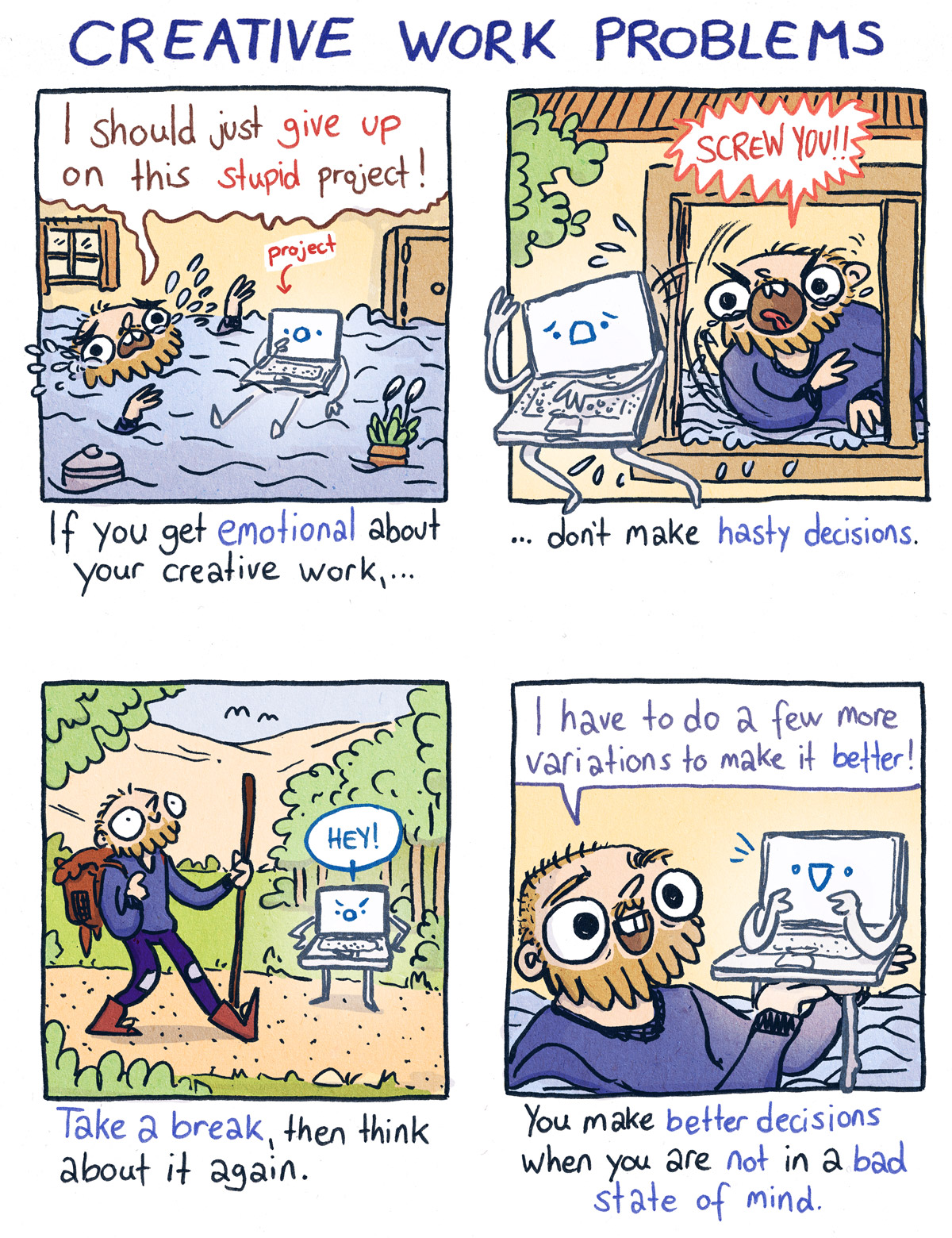 My personal story about not making hasty decisions: I worked on a GIF animation this week and got angry because it just didn’t work. I was about to stop the whole project when I reminded myself to just take a break and work on it later. A few hours later I looked at it again and felt better about the whole thing. I changed stuff and worked on it and now I’m on a good way to finishing it. If I decided to stop it in my bad mood I would have never worked on it ever again.