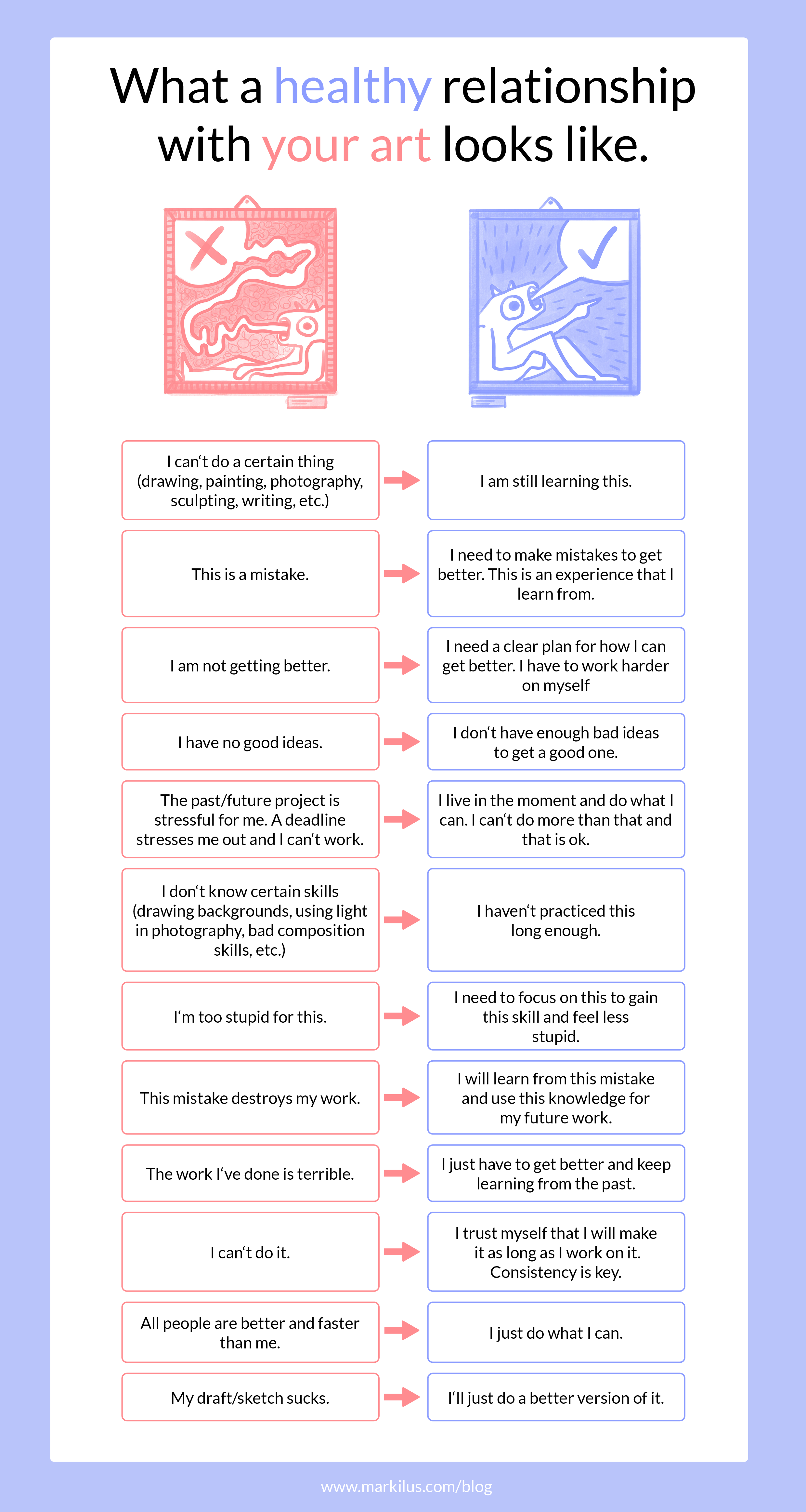 A good mentality and mindset with your art or design work is an important way to keep you motivated and productive. To check this I made a little guide for you. Check out the left column of the picture below. Is this something you say to yourself or that you do? If so, try to change your mindset to the right column. Then you turn the relationship between your art and your creative work into a healthy one.