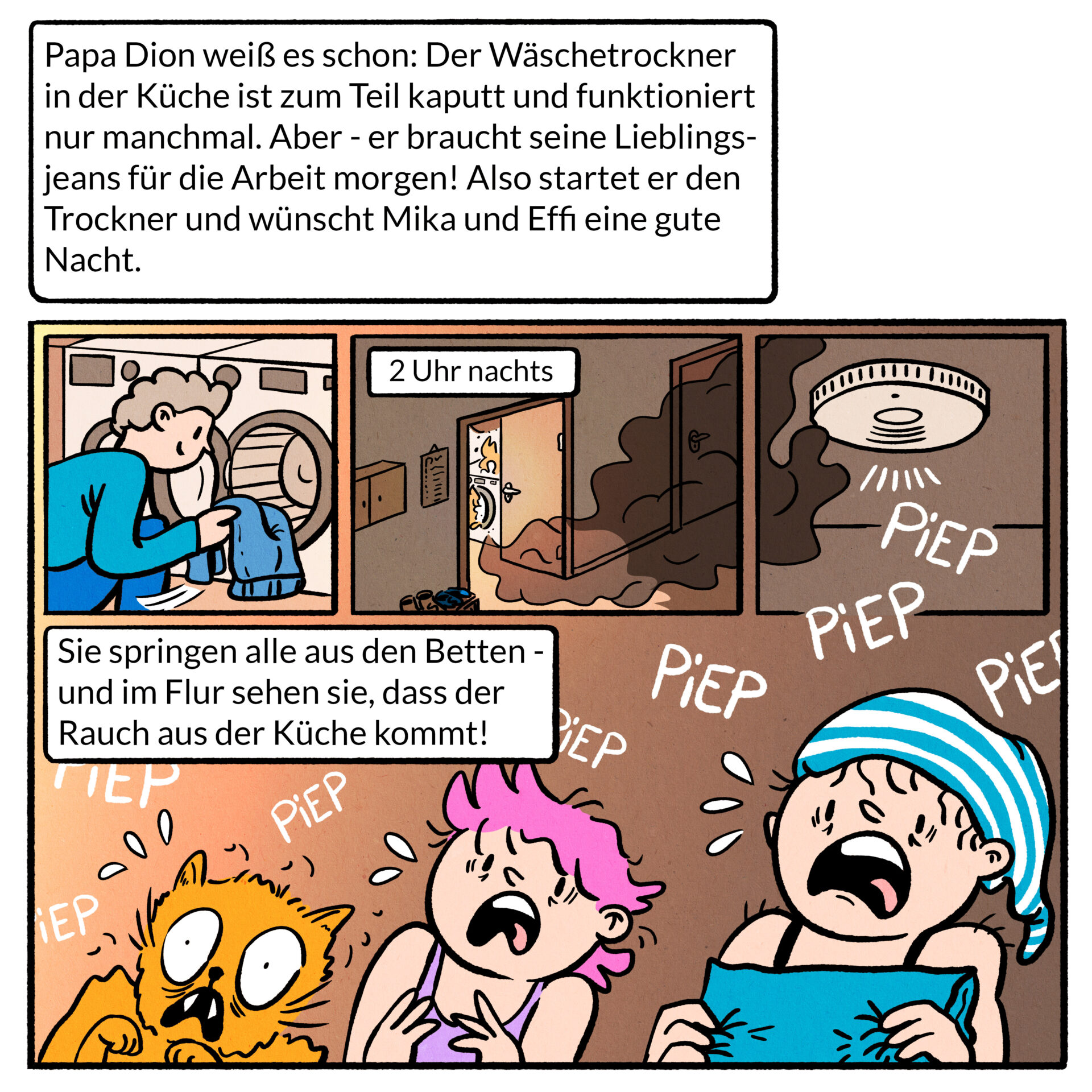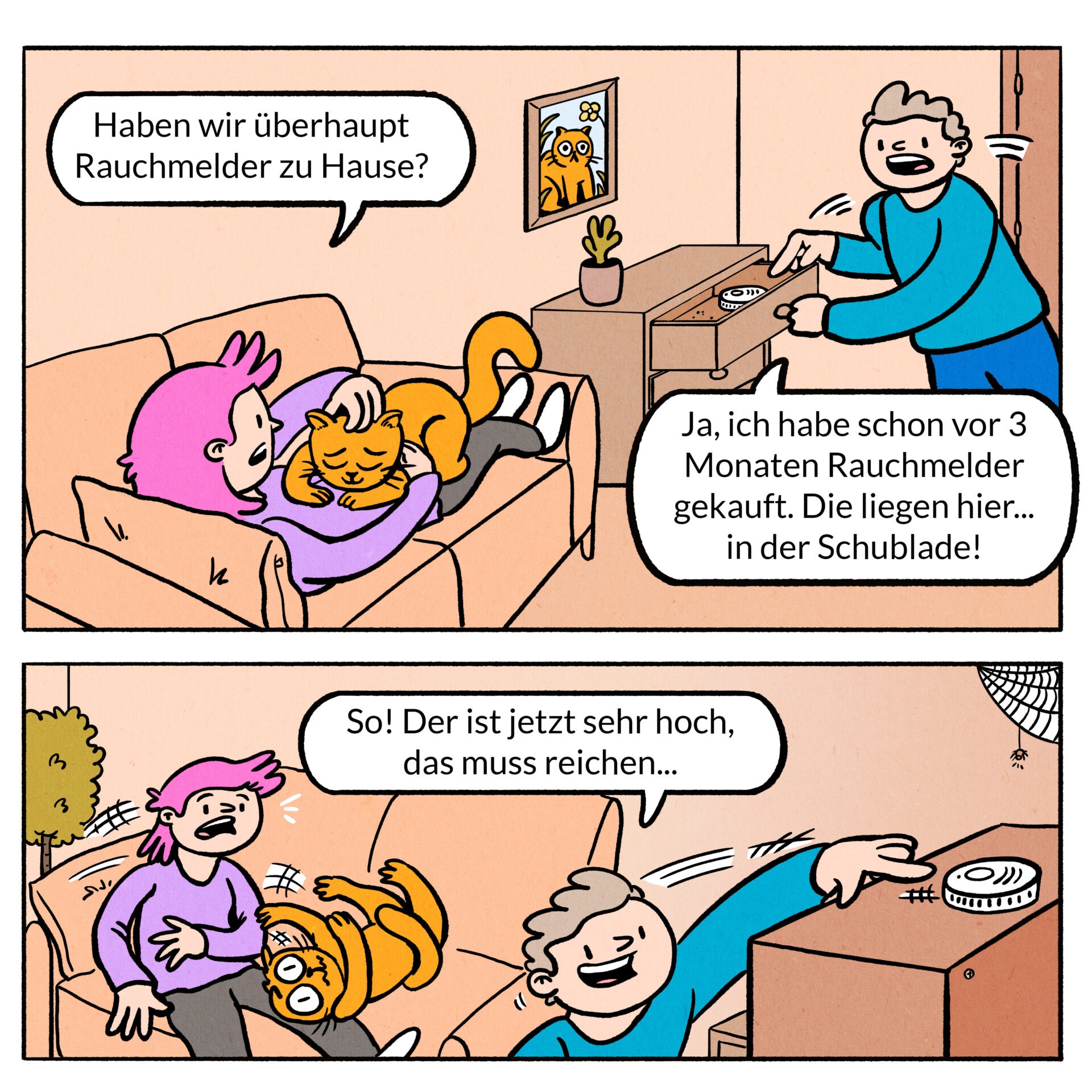 Description: I was commissioned to create illustrations for a fun and engaging online comic-style quiz as part of the public awareness campaign “Rauchmelder retten Leben” (“Smoke Alarms Save Lives”). The aim was to convey the correct behaviour with smoke detectors in a fun way. The quiz features playful scenarios, meme aesthetics, and three recurring comic characters to make the content accessible and memorable for a wide audience.